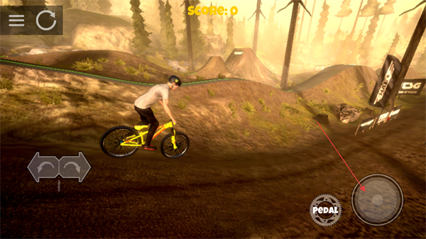 2、进入关卡后,点击界面中的PEDAL按钮踩动自行车齿轮开始骑行,保持在轨迹上推进当前关卡进程。