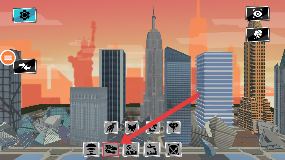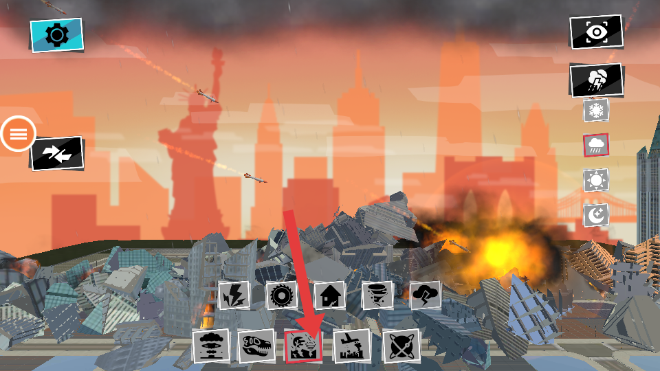 1、选择破坏元素,在游戏界面中,有恐龙、特殊天气等各类代表不同破坏效果的图标,点击你想要的触发的破坏元素的图标。
