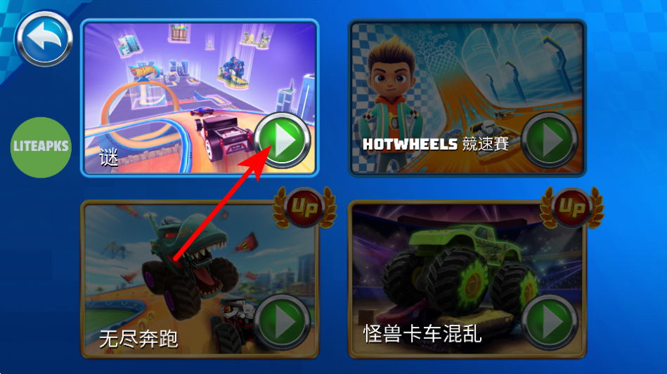 1、在游戏的初始展示界面,点击左侧带有循环图标的按钮,触发界面跳转,进入游戏的玩法模式选择页面,准备游戏内容。