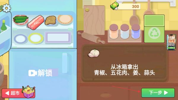1、先点击画面中的冰箱图标,从中依次取出青椒、五花肉、姜和蒜头,将取出的食材放在旁边的操作台上,接着用清水冲洗青椒去除杂质,再用刀具把五花肉切成均匀小块。