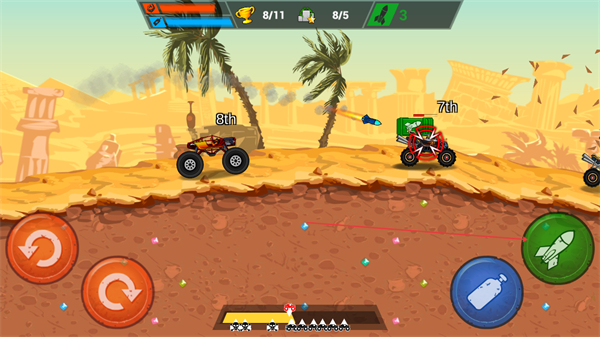 卡车自动行驶,左手操控前后翻滚键调整车身姿态,右手掌控喷气键与发射键,简单两键操作即可完成特技飞跃与道具攻击,新手快速上手。
