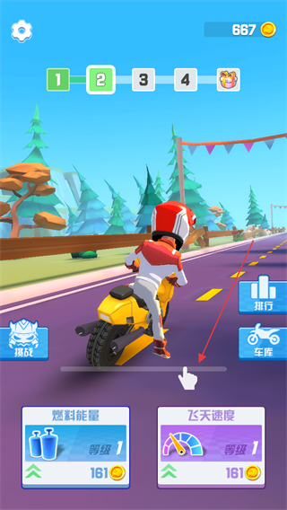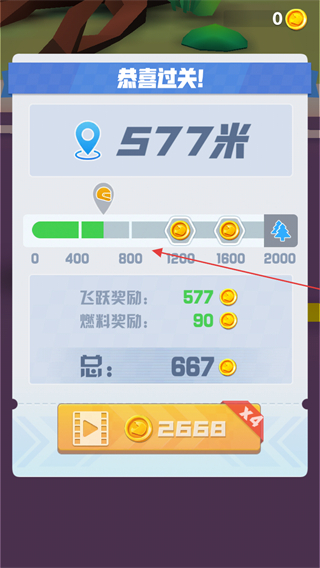 4、通关奖励将根据飞跃的距离进行奖励,不同上限的奖励不同,获取的油瓶燃料将有额外奖励。