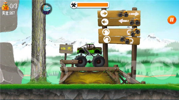 1、点击前翻按键,可控制卡车进行前翻操作,地形调整车身姿态,避免翻车可获取额外分数。