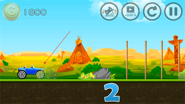 1、操控蓝色赛车在赛道上行驶,注意躲避岩石、木桩等障碍物,利用赛道上的斜坡和木杆辅助行驶。