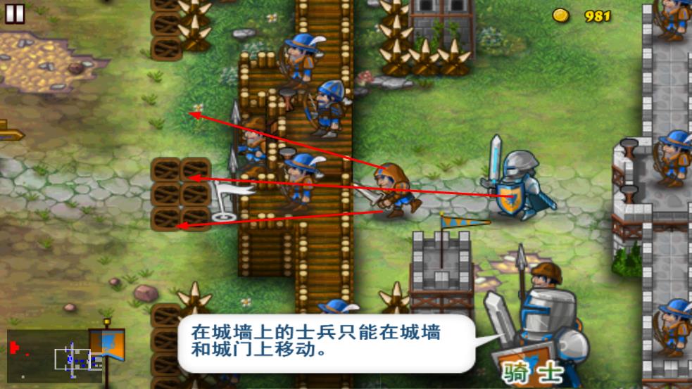 1、城墙上的士兵仅能在城墙和城门上移动,利用这一特性,可在城墙区域布置士兵,守卫城堡关键位置。