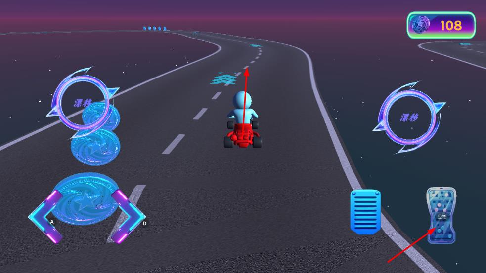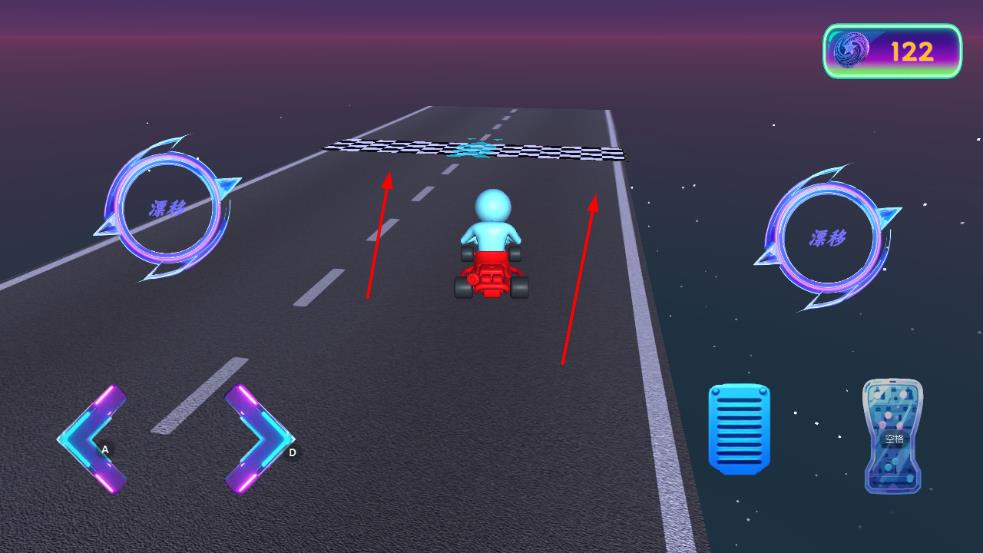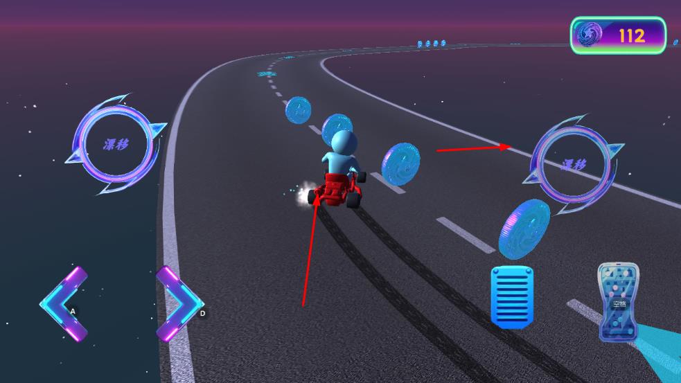 1、操控赛车在道路行驶,利用AD键或对应方向按钮调整方向,还能点击漂移按钮,灵活过弯。