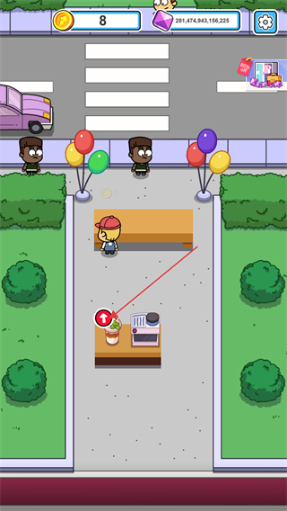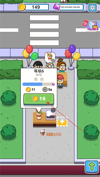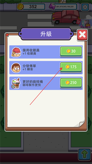 1、当咖啡机上出现红色箭头,代表金币足够升级咖啡等级了点击咖啡机进行升级。