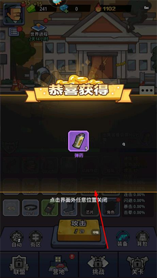 1、点击攻击对敌人发起攻击,推进末世冒险进程,获取装备与资源。