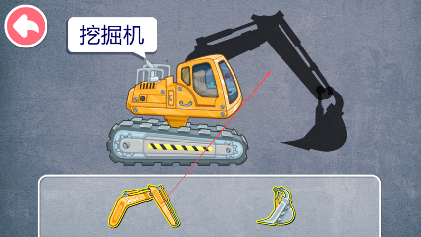 3、继续观察挖掘机部件图案,点击部件并拖动到挖掘机对应的阴影位置,加深对挖掘机结构的认知。