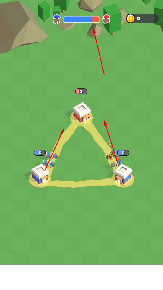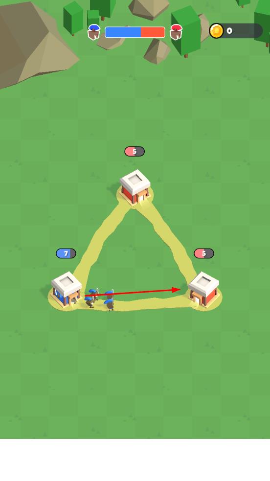1、操控蓝色阵营的士兵在建筑间移动,与红色阵营对抗,通过兵力调配攻占对方建筑。