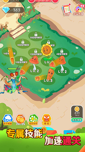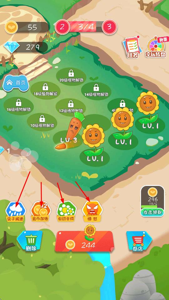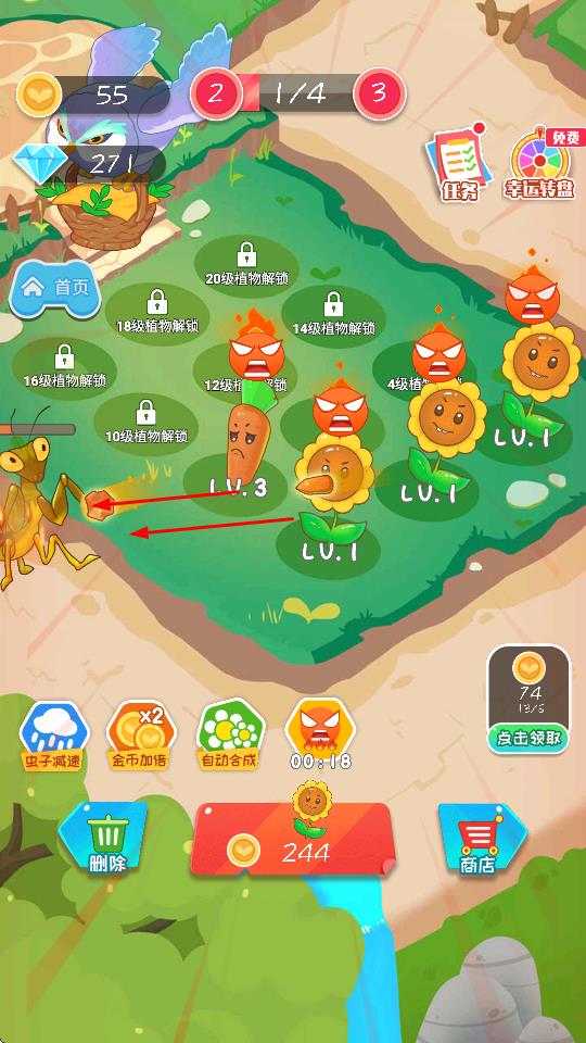 4、利用虫子减速、金币加倍、自动合成、愤怒等功能,优化植物生长环境与资源获取效率,推动植物养成。