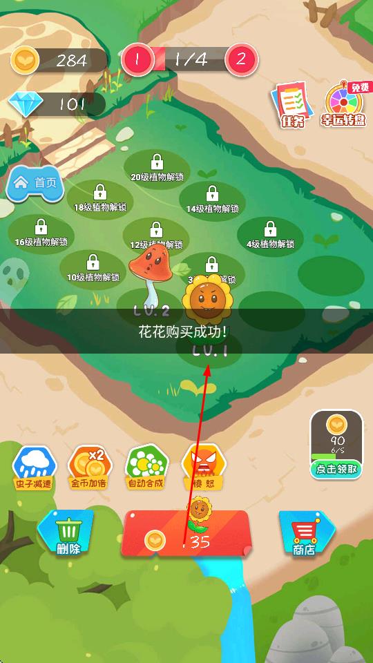 1、在游戏场景中,花费金币购买花花等植物,成功购买后植物会出现在种植区域,开启植物养成之旅。