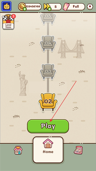 1、这是关卡选择界面,当前可进入Level2,点击界面中的Play按钮,即可进入该关卡;界面上方还展示了当前的资源信息。