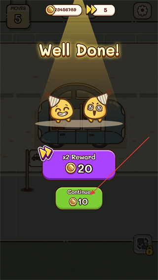 4、完成Level2关卡后,界面出现WellDone的完成提示,点击Continue按钮,即可领取对应的奖励并继续后续的关卡流程。
