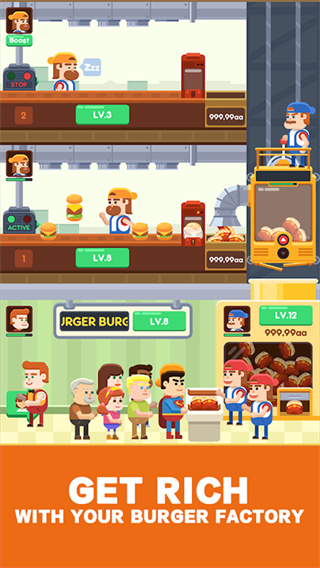 闲置汉堡工厂无限金币是一款集工厂流水线生产与经营模拟于一体的闲置作品,玩法浅显易懂,采用轻松放置模式,无需复杂操作即可快速上手,核心流程围绕汉堡生产与销售展开,先让工厂产出各类汉堡,再通过店铺窗口出售给顾客,获得的金币可用于升级生产设备、开发新菜单、解锁食材,或是改善服务效率,逐步从汉堡小店发展为庞大的饮食帝国。