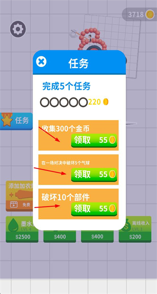 1、完成收集金币、躲避气球等任务,点击领取奖励,积累资源助力游戏进程。