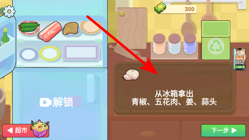 3、当奶奶提出看看冰箱里有什么时,点击好,然后按照提示从冰箱拿出所需食材,像青椒、五花肉、姜、蒜头这些,为后续烹饪做准备。