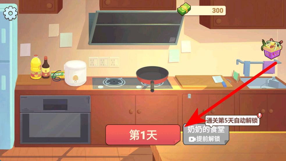 1、进入后,先看到界面上的第1天按钮,点击可开启当天的烹饪经营,还有奶奶的食堂,通关第5天会自动解锁,也能选择提前解锁。