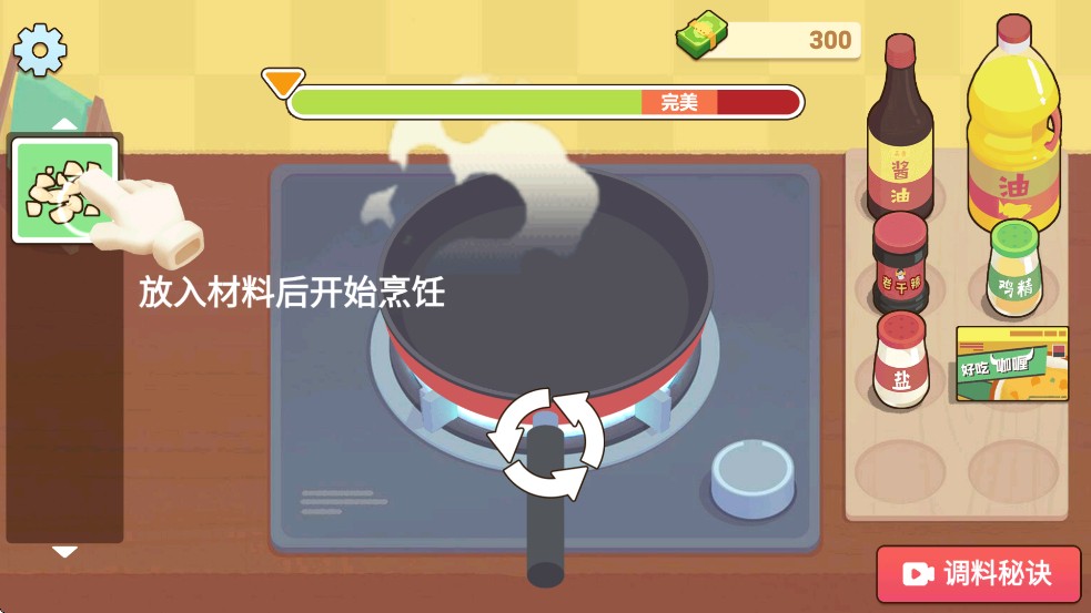 4、拿出食材后,点击下一步,就会进入食材处理与烹饪环节,按照步骤对食材进行切割、翻炒等操作,完成菜品制作,之后还能通过经营获得收益,解锁更多菜谱和内容。
