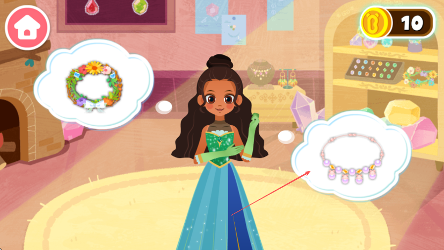 2、童话角色互动:设计公主与王子乘坐南瓜马车来访的剧情,孩子在创作过程中仿佛与童话角色互动,增强代入感,让珠宝搭配不再是单纯操作,更具故事性。