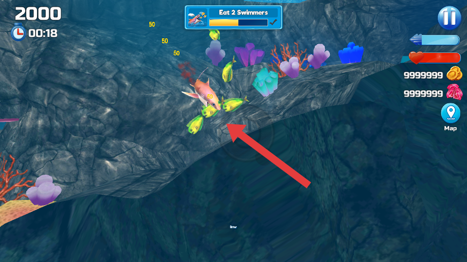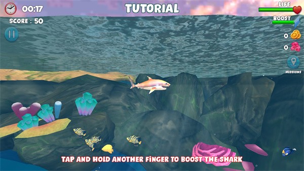 2、鲨鱼捕食游下方的鱼类时,可以获得特殊的效果,同时积累分数,助力完成关卡目标。