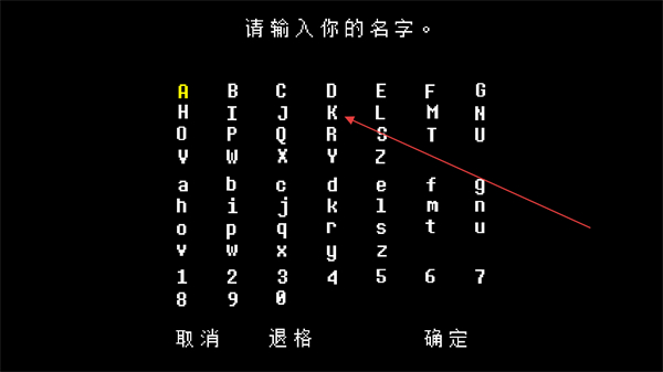 2、这是游戏的名字输入界面,界面提示请输入你的名字,通过选择字符输入名字后,点击确定按钮即可继续推进游戏。