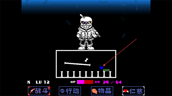 4、这是游戏的战斗界面,界面底部有战斗、行动等选项,需选择对应选项进行操作让战斗界面中的爱心躲避攻击,并关注HP状态避免归零。
