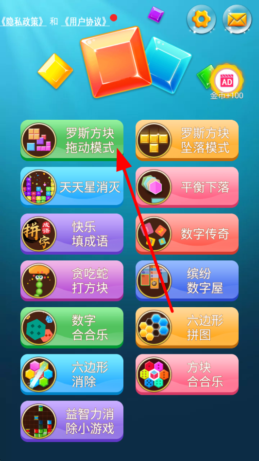 1、玩家进入后,从诸多玩法里挑选心仪的,比如选择拖动模式,进入对应游戏界面,准备开启方块放置与消除的休闲挑战。