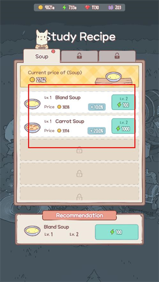 2、进入食谱界面,通过内置菜单解锁汤谱,升级汤品品质以提高收益倍率。