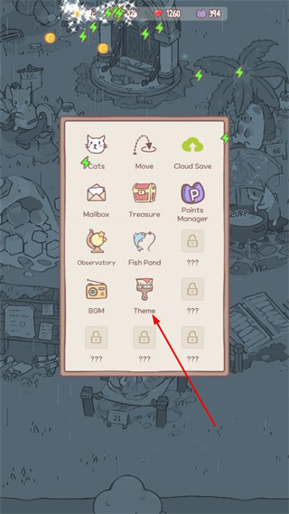 3、打开功能菜单,选择主题选项,切换场景风格,自定义汤屋的视觉氛围。