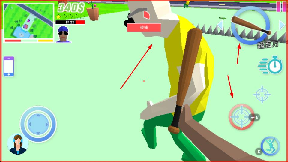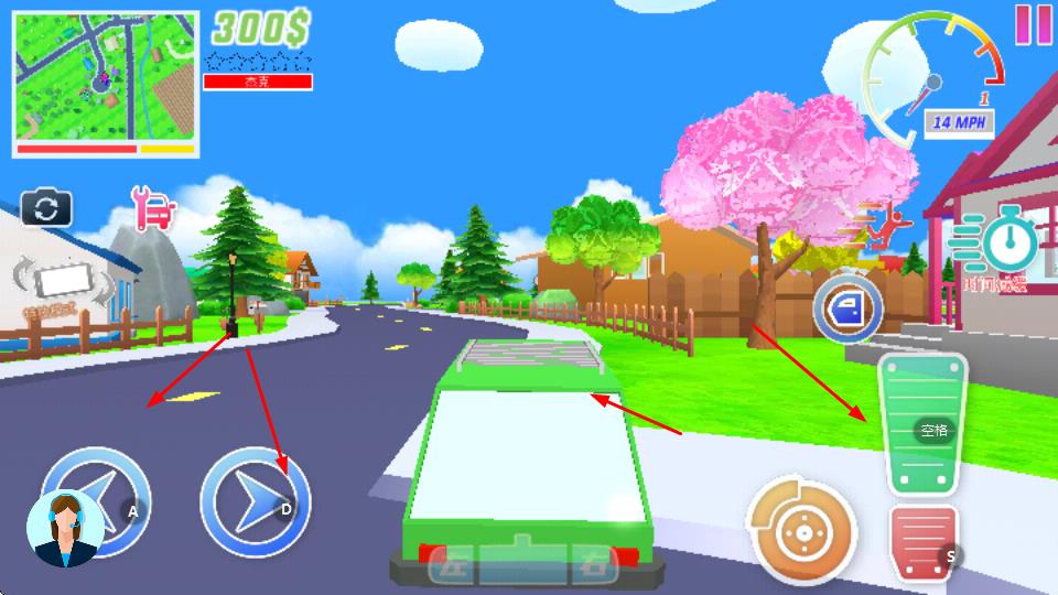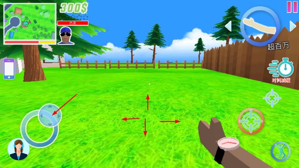1、操控角色在草地、街道等场景移动,利用左侧虚拟摇杆调整方向,探索地图,初始可获取300美元等资源。