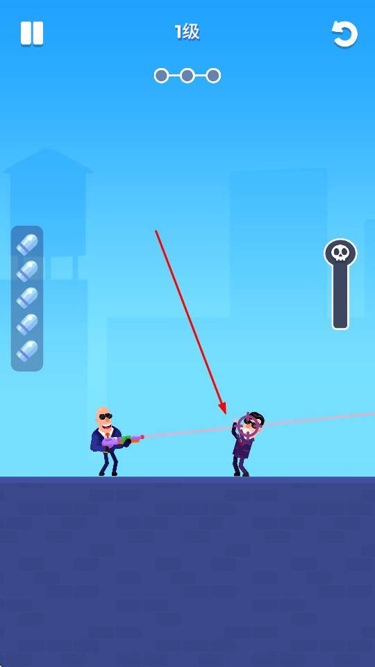 2、进入关卡后,滑动操控手枪发射方向,瞄准并射击前方的敌人,将敌人击倒,完成关卡任务。