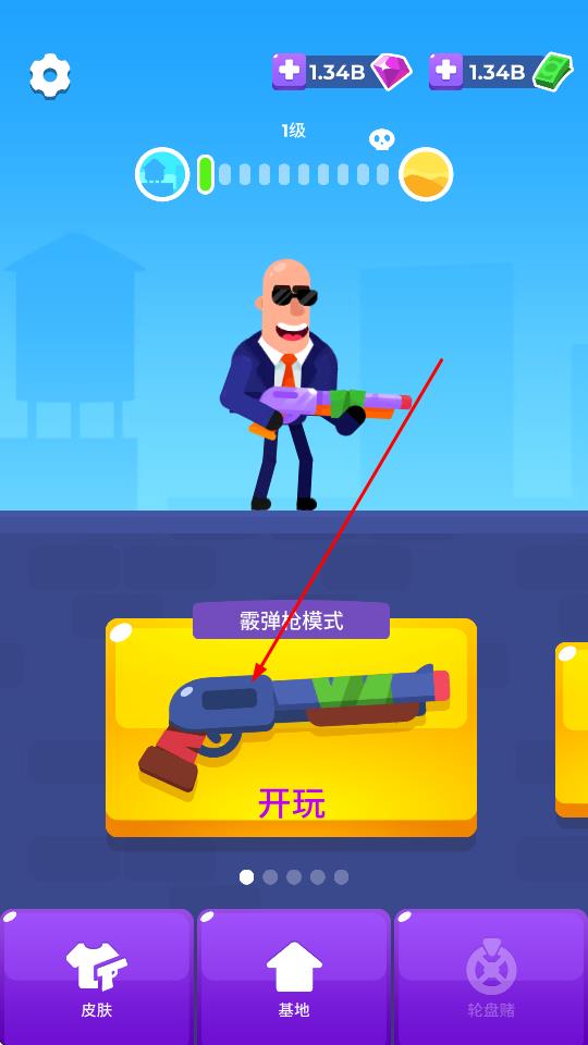 1、进入游戏主界面,点击开玩按钮,选择枪械模式后即可开启射击关卡。