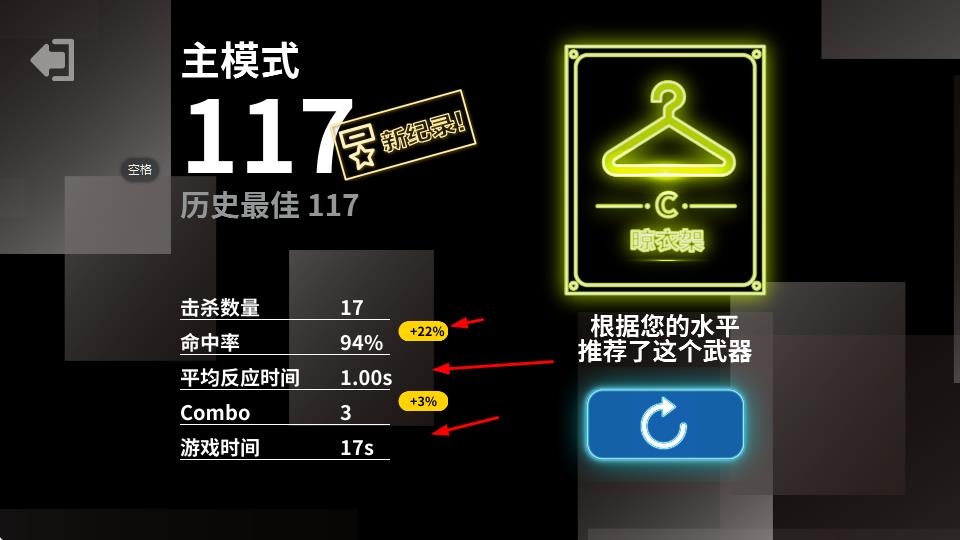 4、游戏结束后,查看主模式得分、击杀数量、命中率等数据,还会根据水平推荐武器,点击重新开始按钮可再次挑战。