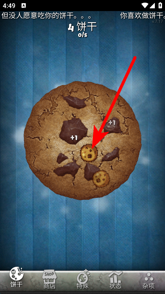 1、进入游戏后,看到屏幕中的饼干,点击它,可获取饼干,每次点击会增加饼干数量,不断点击能积累更多饼干。