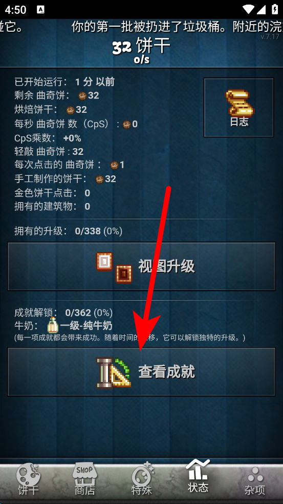 4、切换到状态界面,点击查看成就,能了解成就解锁情况,朝着解锁更多成就的目标,继续积累饼干,推进游戏进程。