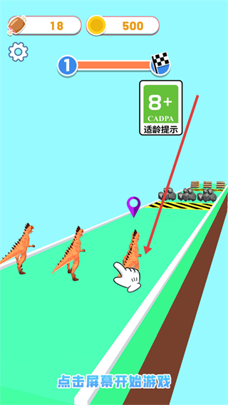 1、点击屏幕开始游戏,控制恐龙在跑道上移动奔跑。