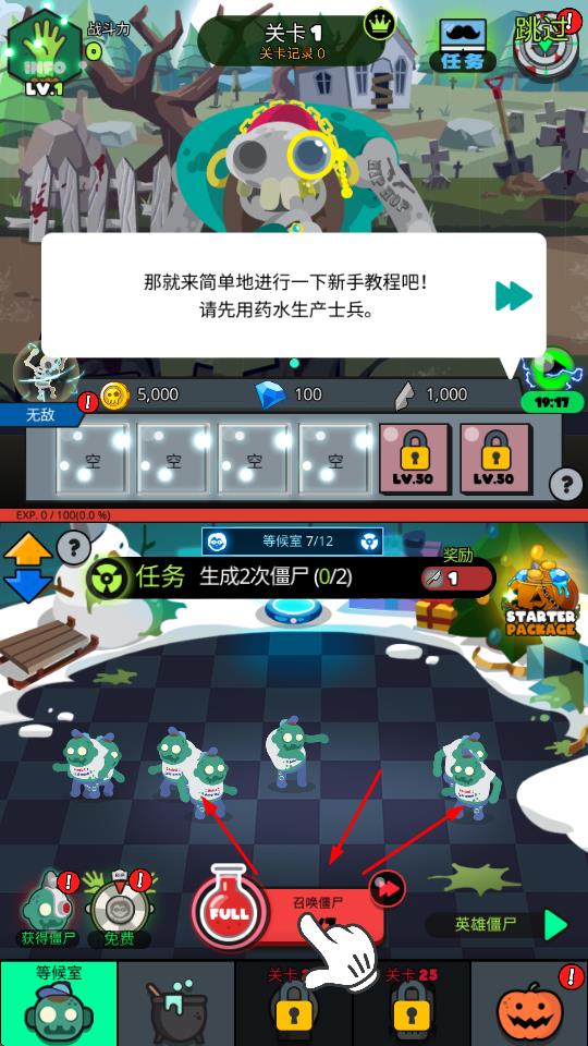 1、新手教程阶段,先用药水生产士兵,点击召唤僵尸按钮可生成僵尸。