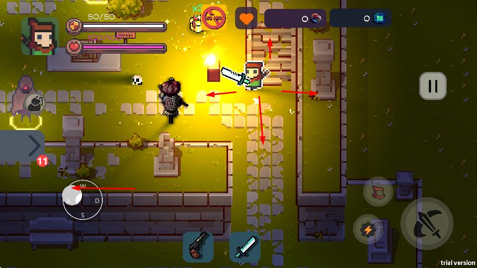 1、通过W、A、S、D键操控角色在地牢场景移动,探索带有烛光、石像的区域,靠近敌人时可开启战斗。