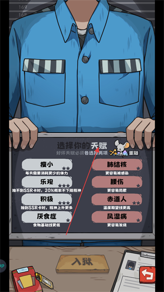 2、进入监狱后,选择入狱前的身份职业,不同身份有不同的技能效果,在监狱中能有不同作用。
