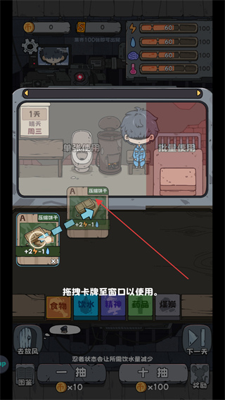 4、拖动物资卡牌进入窗口,让角色使用卡牌进行食物物资的获取提高上方的数值。