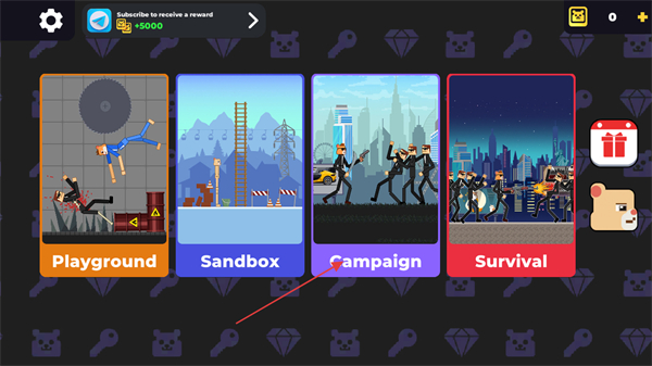 1、进入游戏后会呈现Playground、Sandbox、Campaign、Survival等模式选项,点击对应选项即可进入相应玩法模式开始游戏。