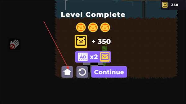4、关卡达成LevelComplete后可获得对应奖励,点击小房子图标按钮即可回到游戏菜单主页。