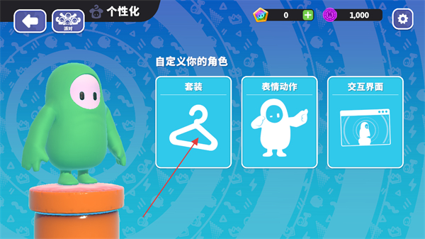 3、在个性化界面中,可以自定义角色,点击套装可以将刚刚购买的服装进行穿戴。