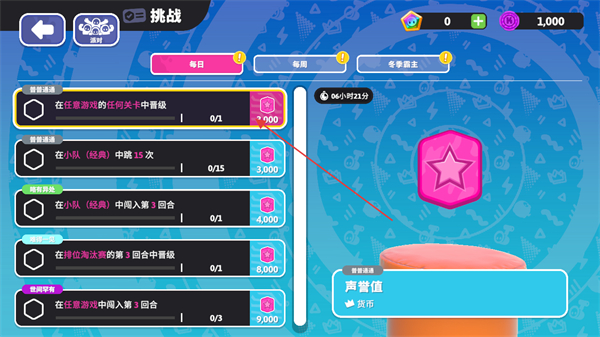 1、在游戏挑战界面,可以查看每日、每周和每个赛季的限时任务挑战,完成挑战可以获取到声誉值进行购物使用。