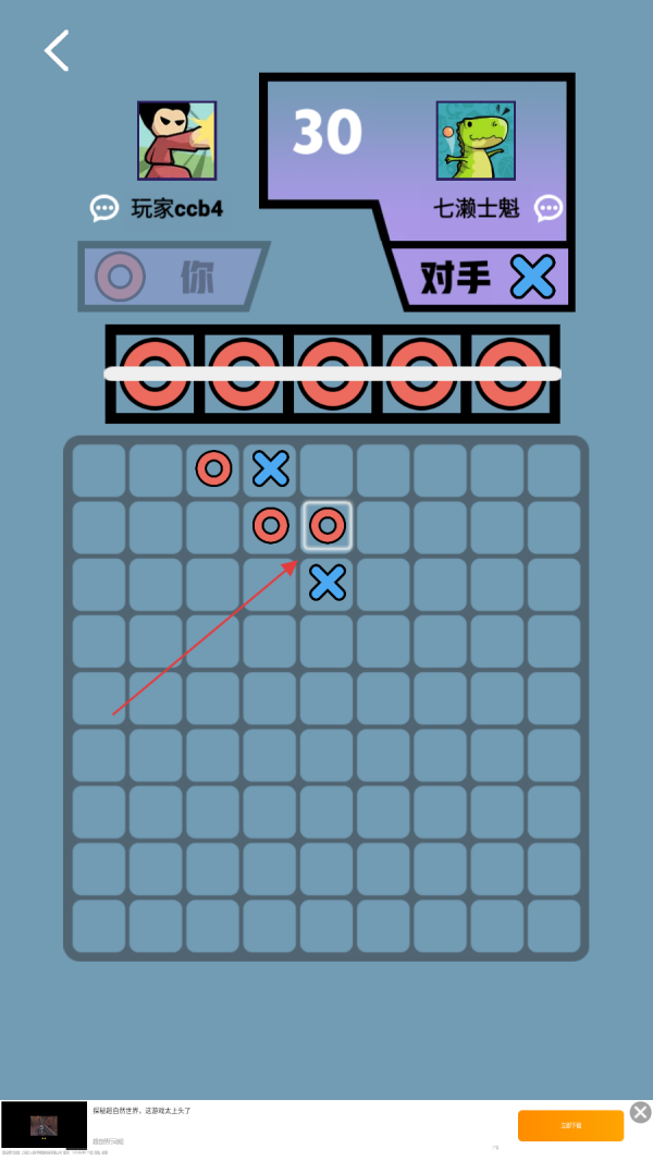 1、进入游戏后,查看上方玩家信息与己方符号,己方为圆形符号时,观察棋盘空格,选择合适位置点击放置圆形,以此开启对战布局。