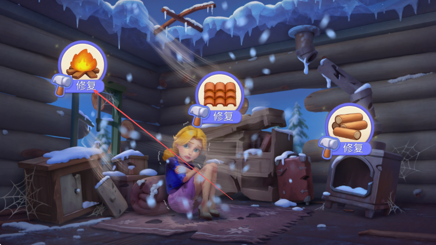 1、进入游戏,看到木屋中有需要修复的设施,如篝火,点击篝火进行修复。
