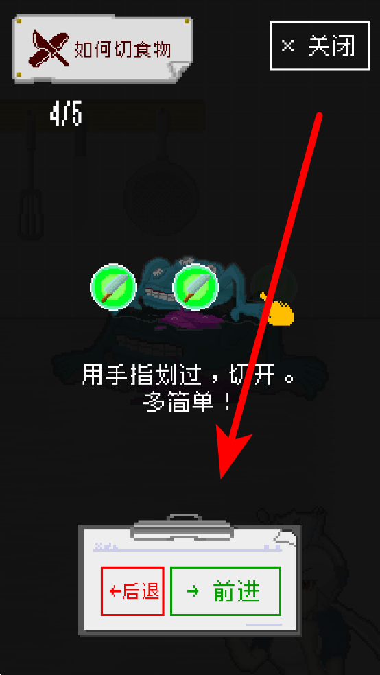 1、游戏开始会有操作提示,切食物时,按照提示用手指划过屏幕,即可切开食物,完成食材的初步处理,为后续烹饪做好准备。