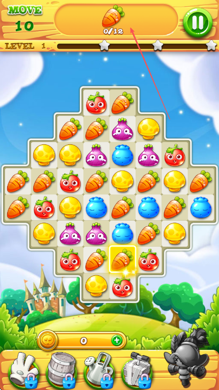 2、利用剩余步数,仔细观察盘面,优先选择能消除胡萝卜的移动方案,规划好消除步骤以提高效率。