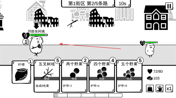 3、在战斗中,选择合适的物品卡片,如柠檬造成伤害,野果增加护甲,应对敌人邻居张阿姨的攻击。